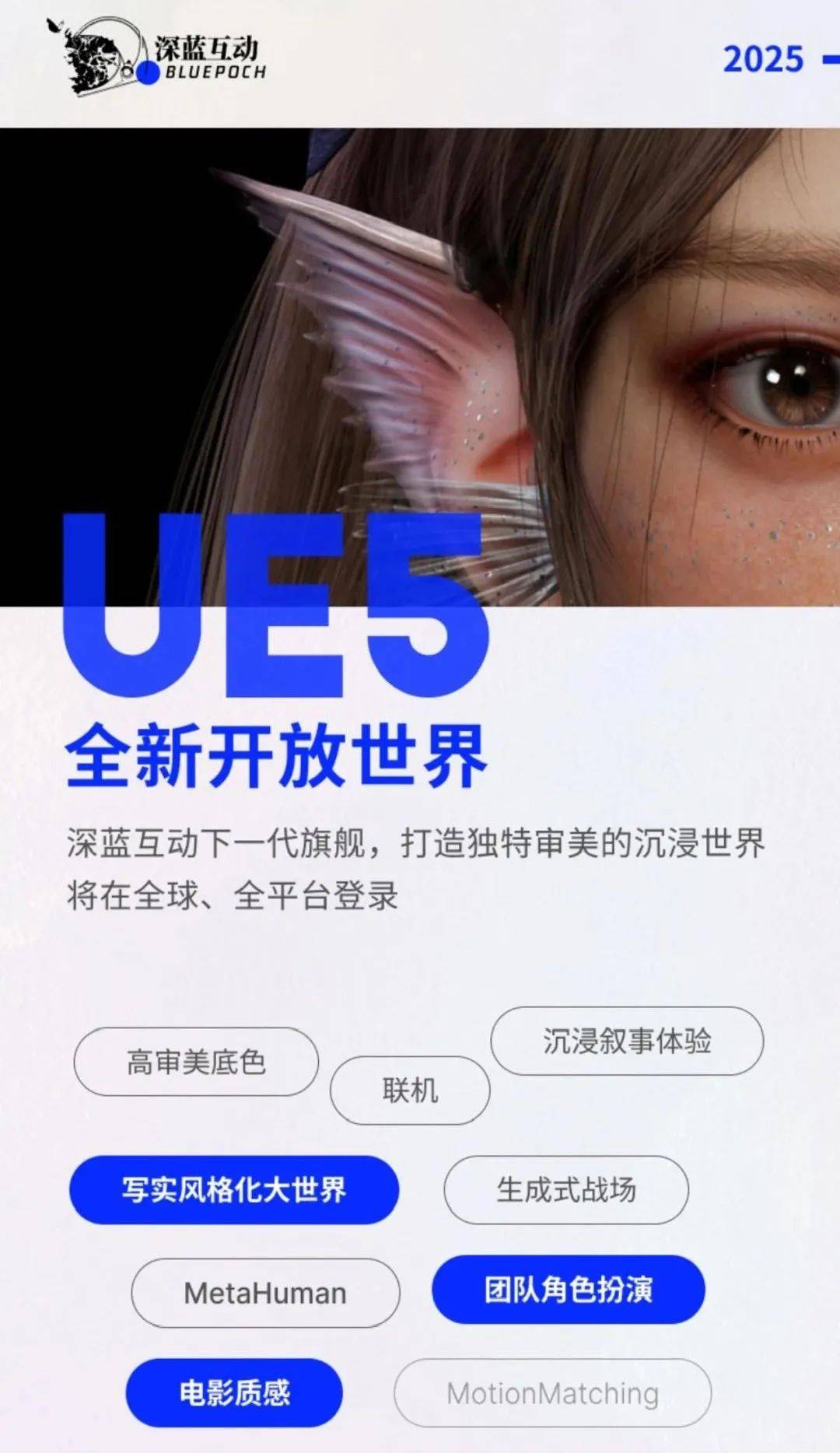 深蓝互动曝光UE5新作。19日,《重返未来:1999》研发商深蓝互动放出一批招聘岗位,曝光了下一代旗舰项目的招聘信息,是一款由深蓝互动CEO周剑亲自带队,使用虚幻5开发的写实风格3D大世界RPG,目标是计划面向全球,在全平台上线。