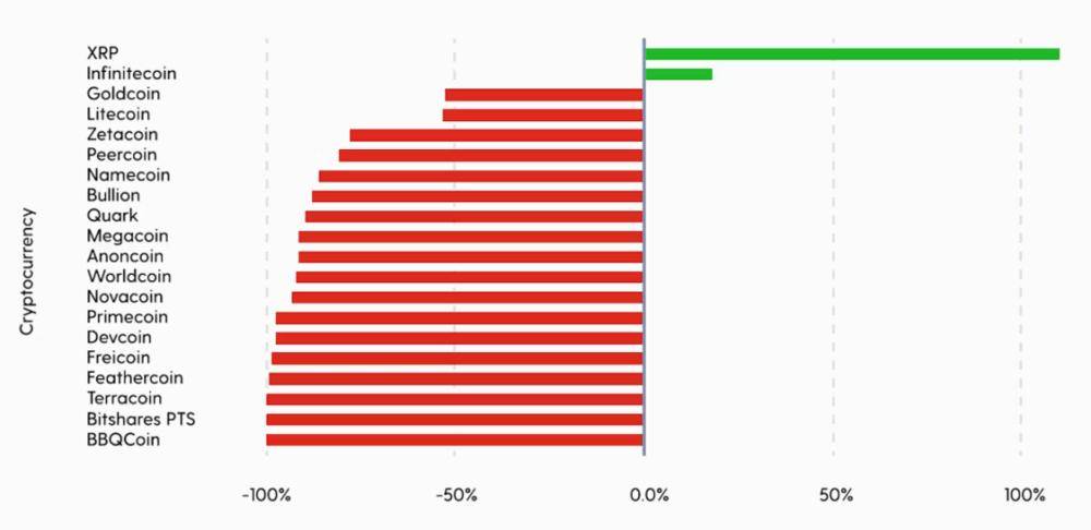 这是2013年比特币市值最高时排名前20的山寨币,在2017年牛市中相对比特币的表现。