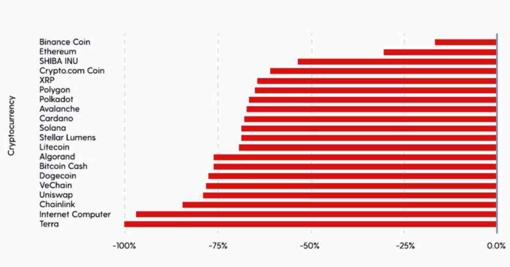 这是2021年比特币市值最高时排名前20的山寨币,到2022年熊市时相对比特币的表现。