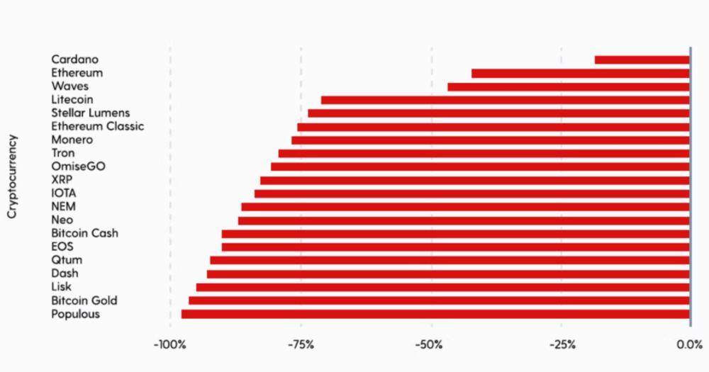 这是2017年比特币市值最高时排名前20的山寨币,到2022年熊市时相对比特币的表现。