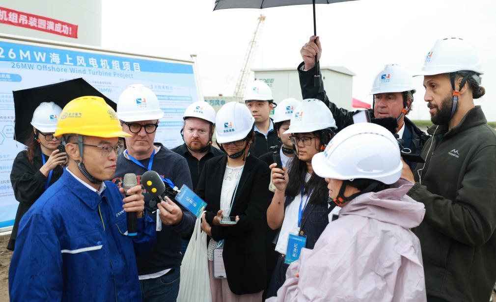 9月19日,中外媒体记者在位于山东东营的26兆瓦级海上风力发电机组项目现场采访。新华社发