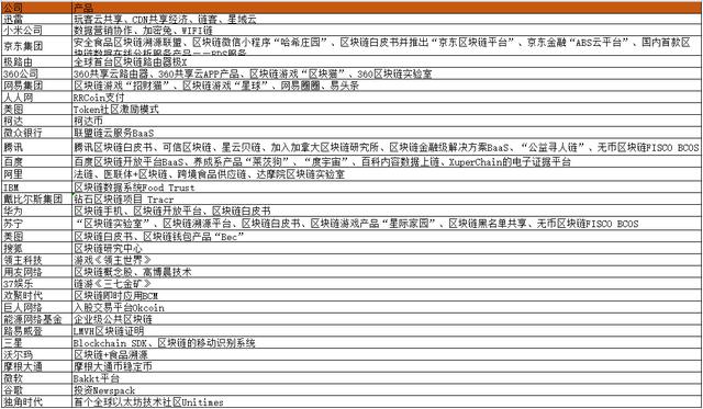 行业标兵安全食品区块链溯源联盟、区块链微信小程序“哈希庄园”、区块链白皮书并推出“京东区块链平台”、京东金融“ABS云平台”、国内首款区块链数据在线分析服务产品——BDS服务;“区块链实验室”、区块链溯源平台、区块链白皮书、区块链游戏产品“星际家园”、区块链黑名单共享、无币区块链FISCO BCOS;迅雷打造了玩客云共享、CDN共享经济、链客、星域云;360公司打造了360共享云路由器、360共享云APP产品、区块链游戏“区块猫”、360区块链实验室;网易集团打造了区块链游戏“招财猫”、区块链游戏“星球”、网易圈圈、易头条;华为打造了区块链手机、区块链开放平台、区块链白皮书;