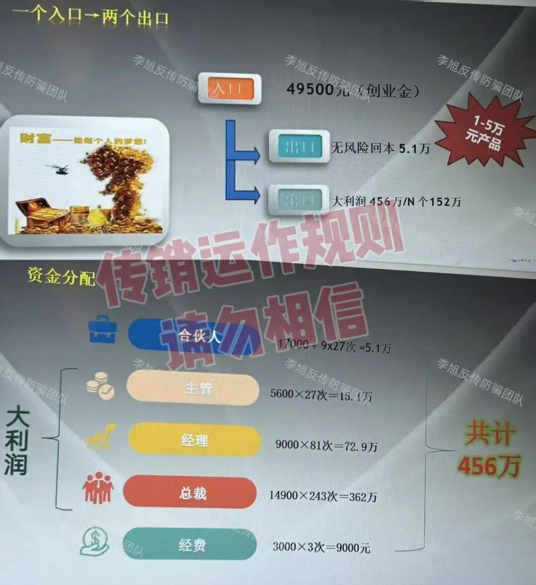 组织方承诺两大收益出口:一是“无风险回本5.1万”,附赠1-5万元产品;二“大利润收益”,最高可获456万或多个152万,收益上限取决于“个人资源与运作能力”。