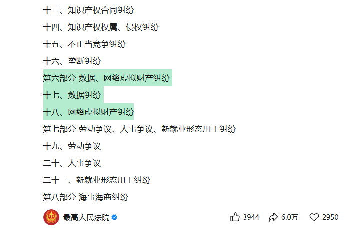 如今,最高法将“数据、网络虚拟财产纠纷”独立列为一级案由,并下设“网络虚拟财产纠纷”作为二级案由。这种结构性的调整向基层法院释放了明确信号:虚拟财产属于受法律承认的民事权利客体,此类纠纷属于法院民事受案范畴。