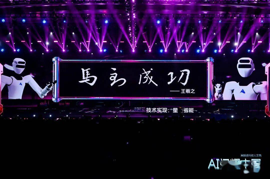 刚才大家看到的是打拳,接下来我想请大家看一场书法比赛。写毛笔字极其困难,因为毛笔非常柔软,对控制精度要求极高。深圳有一家机器人公司叫星尘智能,今年5月我去调研时看到机器人写毛笔字,当时我就和创始人约定,希望在年底让它和我同台比赛,写王羲之的“马到成功”。