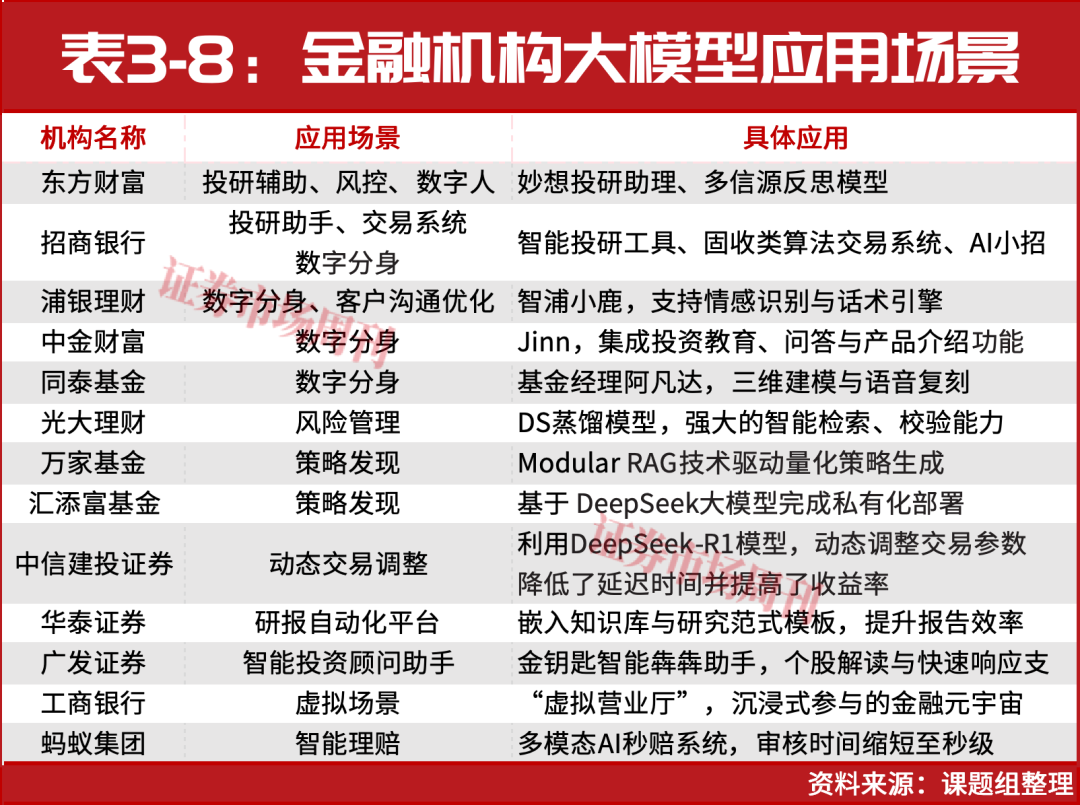 在交易执行环节,大模型同样在重塑传统路径选择机制。招商银行构建的固收类算法交易系统利用大模型对银行间市场报价行为进行建模,预测短期报价走势,从而提升了报价匹配与成交效率。中信建投证券利用DeepSeek-R1模型分析历史交易数据、市场微观结构及交易对手行为,动态调整交易参数(如订单类型、执行时间窗口),降低了延迟时间(将高频交易延迟从5毫秒降至3毫秒)并提高了收益率。同时,它还监控了800多项风险指标,覆盖股票、债券、衍生品等多个市场。这些系统背后依赖的都是大模型在时间序列预测、行为金融分析与微观结构识别方面的强大能力(见表3-8)。