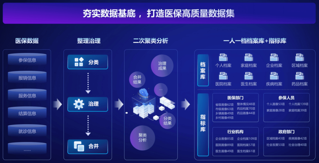 (三)建设“111N”体系架构。建成“一个数据库”,整合各类基础数据,确保数据的全面性、准确性和一致性。形成“一批业务档案”,形成对人、户、企业、区域、医院、医生、疾病、药品等全方位的档案。构建“一个决策支持中心”,推动数据的可视化展示与高效利用。打造“N个场景应用”,全面赋能医保改革、管理、服务,形成全民参保、病贫共济、浙里医小档等应用。