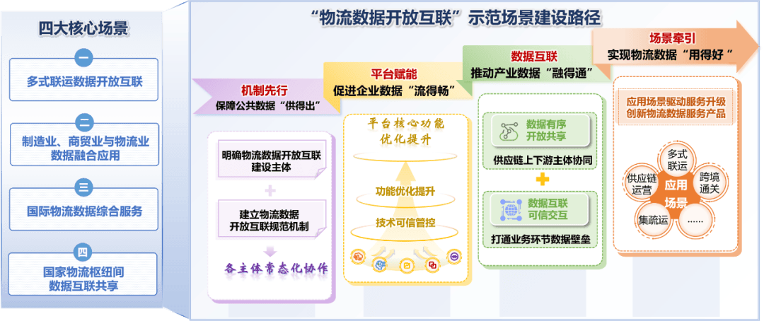 (四)场景牵引,实现物流数据“用得好”。聚焦多式联运、国际物流等重点场景,需求导向培育数据服务产品,推动多式联运“一单制”、跨境物流“一站式”追踪等特色数据应用,促进数据产品化、产品价值化,探索数据资产登记、数据产品交易新模式,激活物流数据要素价值。