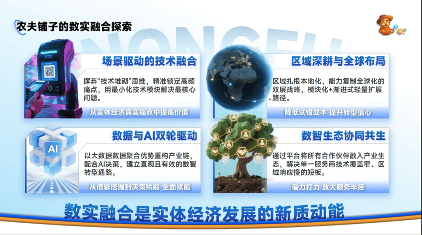 农夫铺子以党的二十届四中全会精神为指引,立足中小企业发展需求,从技术自研、场景落地、生态赋能三个维度发力,构建起全链条、全场景、全周期的数智化服务体系,实现数实融合从“单点突破”向“系统集成”转变,从“技术赋能”向“生态共生”升级。